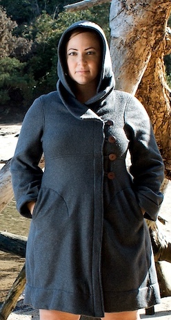 This coat is made of an incredibly soft dark grey fleece. There are patch pockets, large flared sleeves, a big collar, a fitted princess bodice and a large removable hood. It is incredibly warm and comfortable.