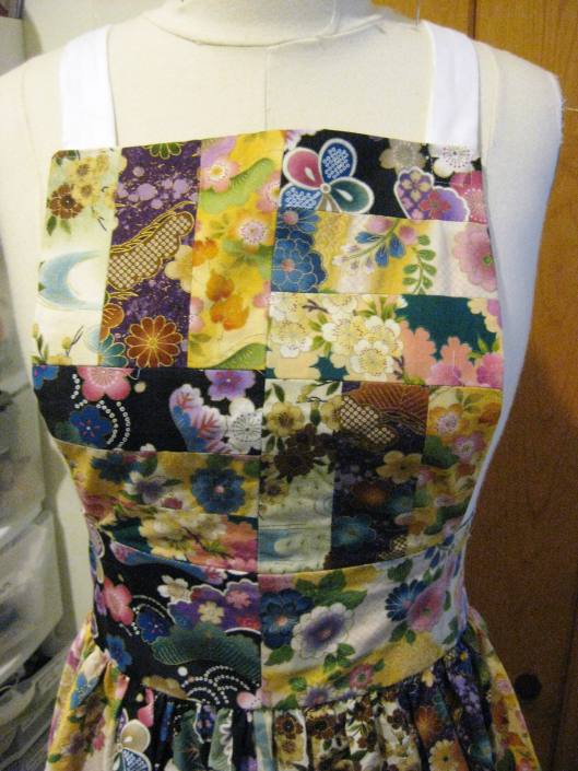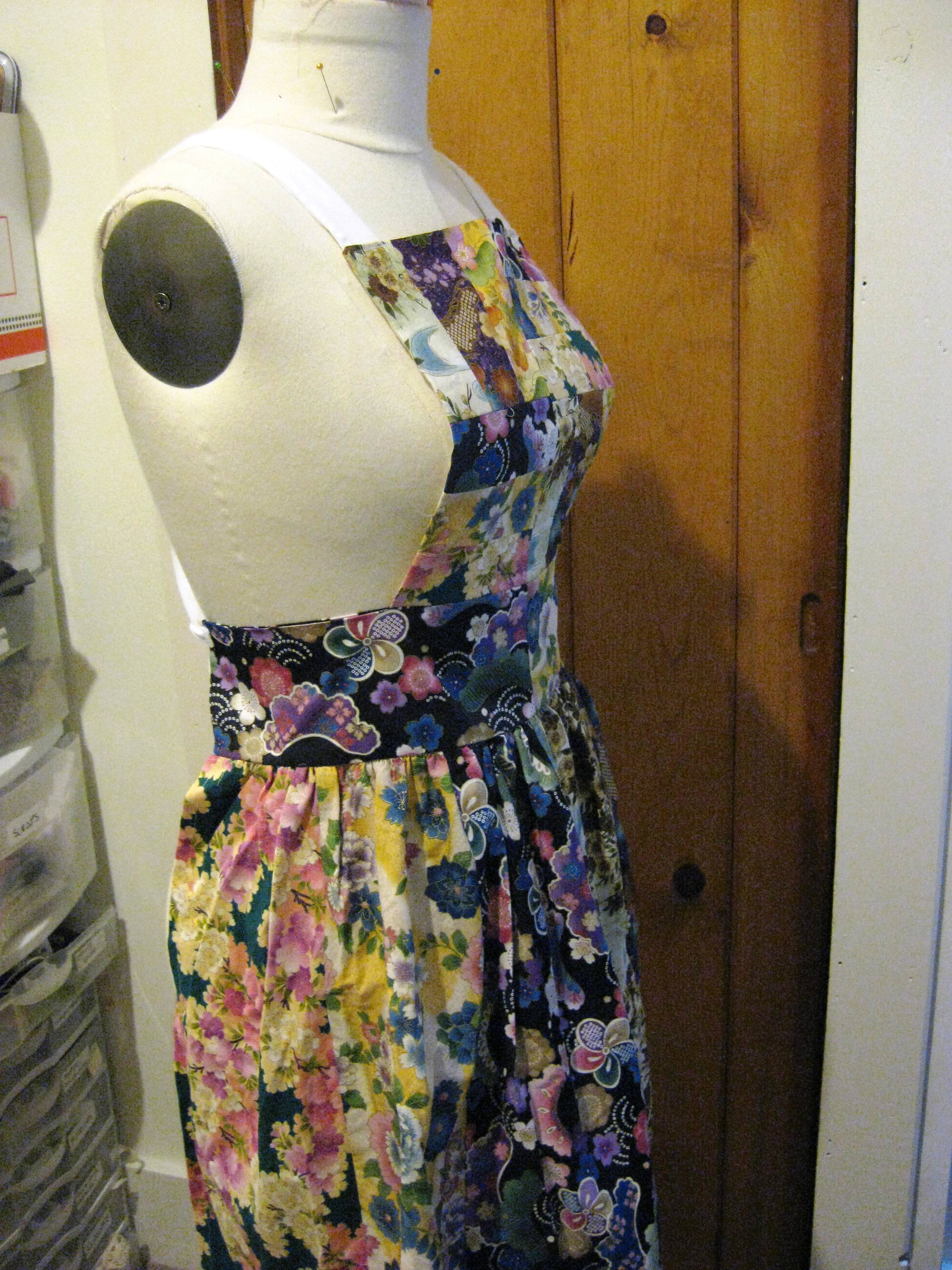 The one major design change I made was to do away with the standard behind the neck strap and waist tie. I wanted something that was not uncomfortable around the neck and felt nice and secure while you were wearing it. I came up with the crossing at the back and tying at the waist. I need to make the straps a little longer to help facilitate tying this on your own, but I like the final look and feel of the design.