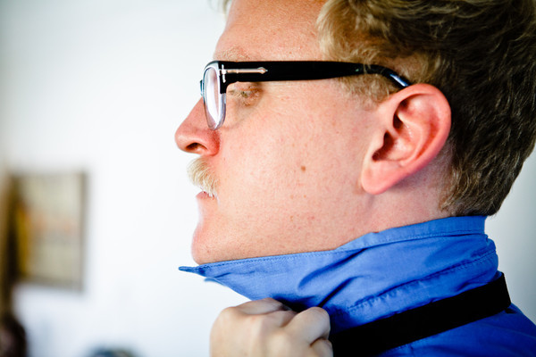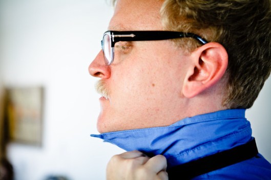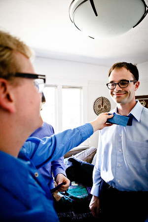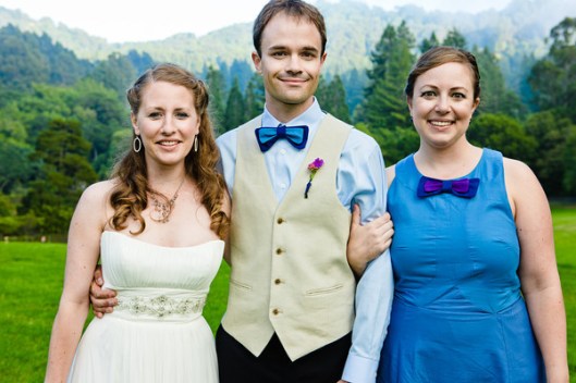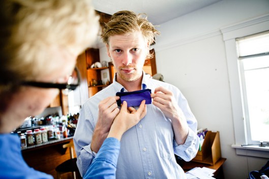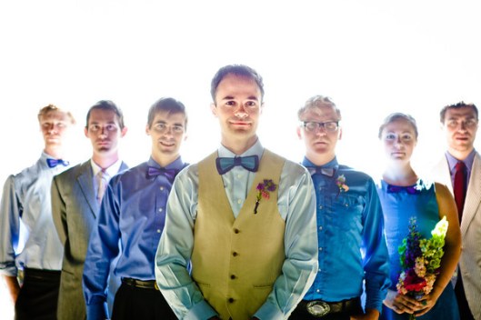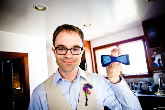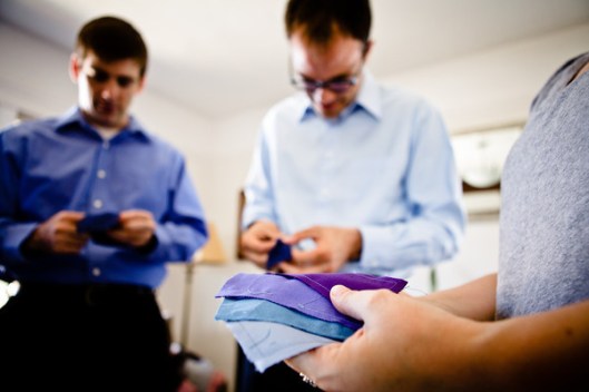The bow ties were going to be made of two different colors. We all started with the same base color and then chose from the four colors I had for the second. You can see Andy and Bret hard at work turning the little rectangles inside out (yes, that’s how late we did this, but it really only took about 5 minutes as I had already sewn all the pieces.)