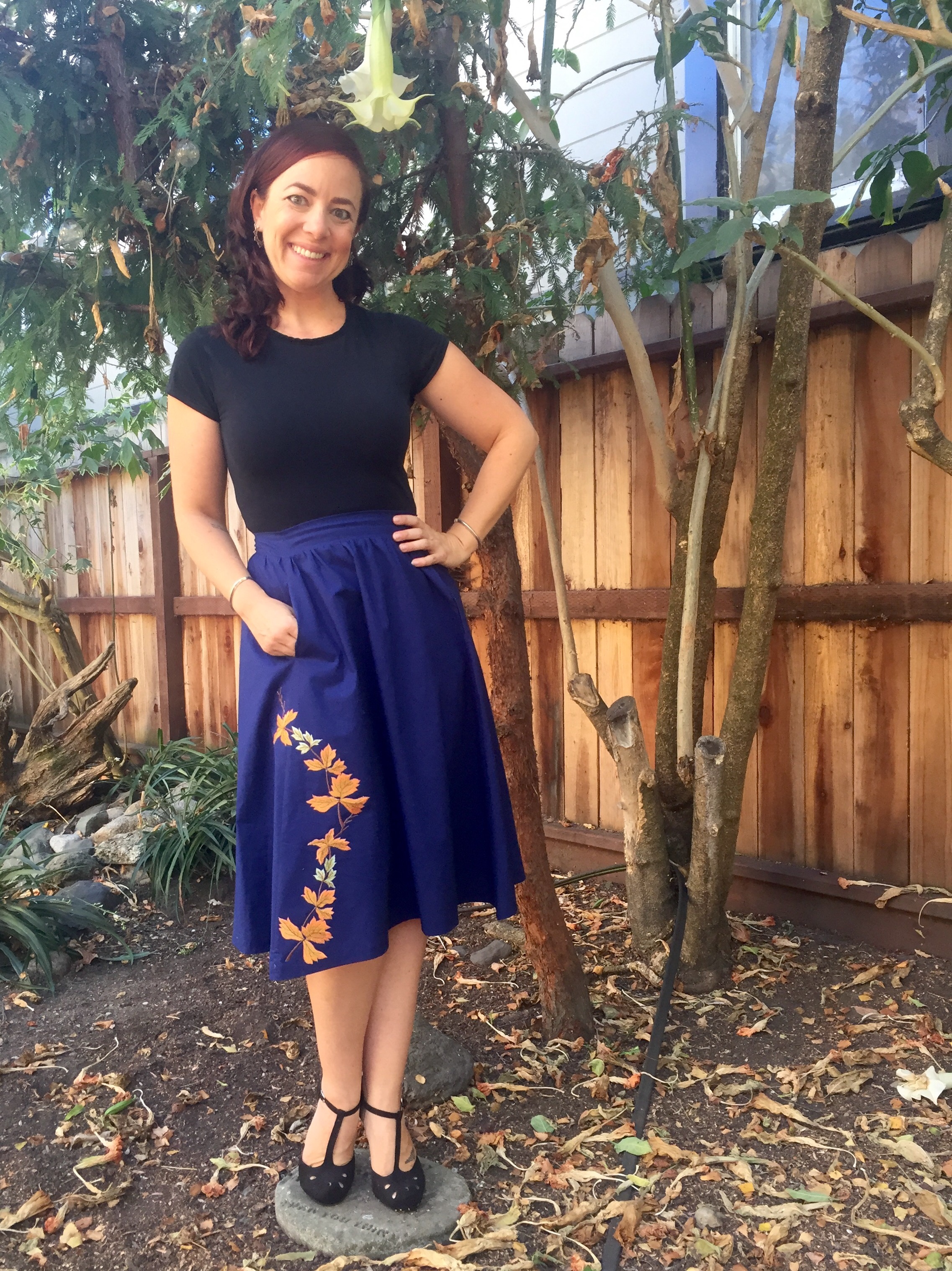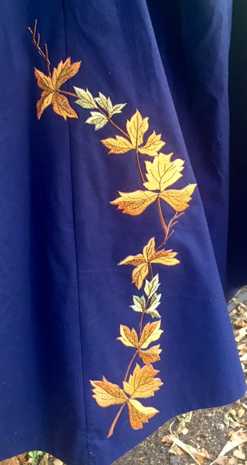 It is still a simple dark blue skirt with pockets, but now it’s got this really beautiful added detail of Autumn leaves cascading down skirt. The detail was actually two sets of please put together. I still have a third set of believes that I will do something else with.