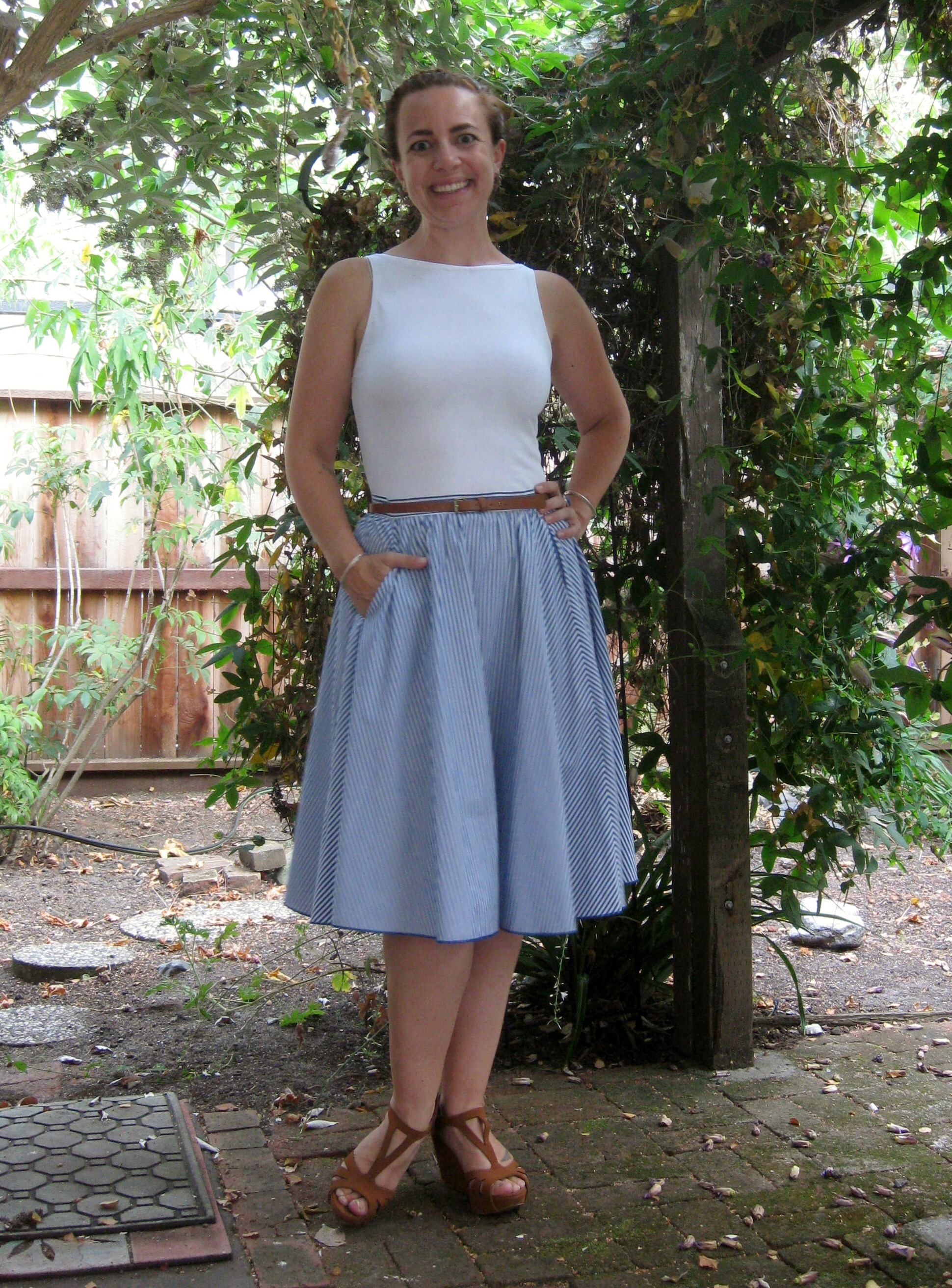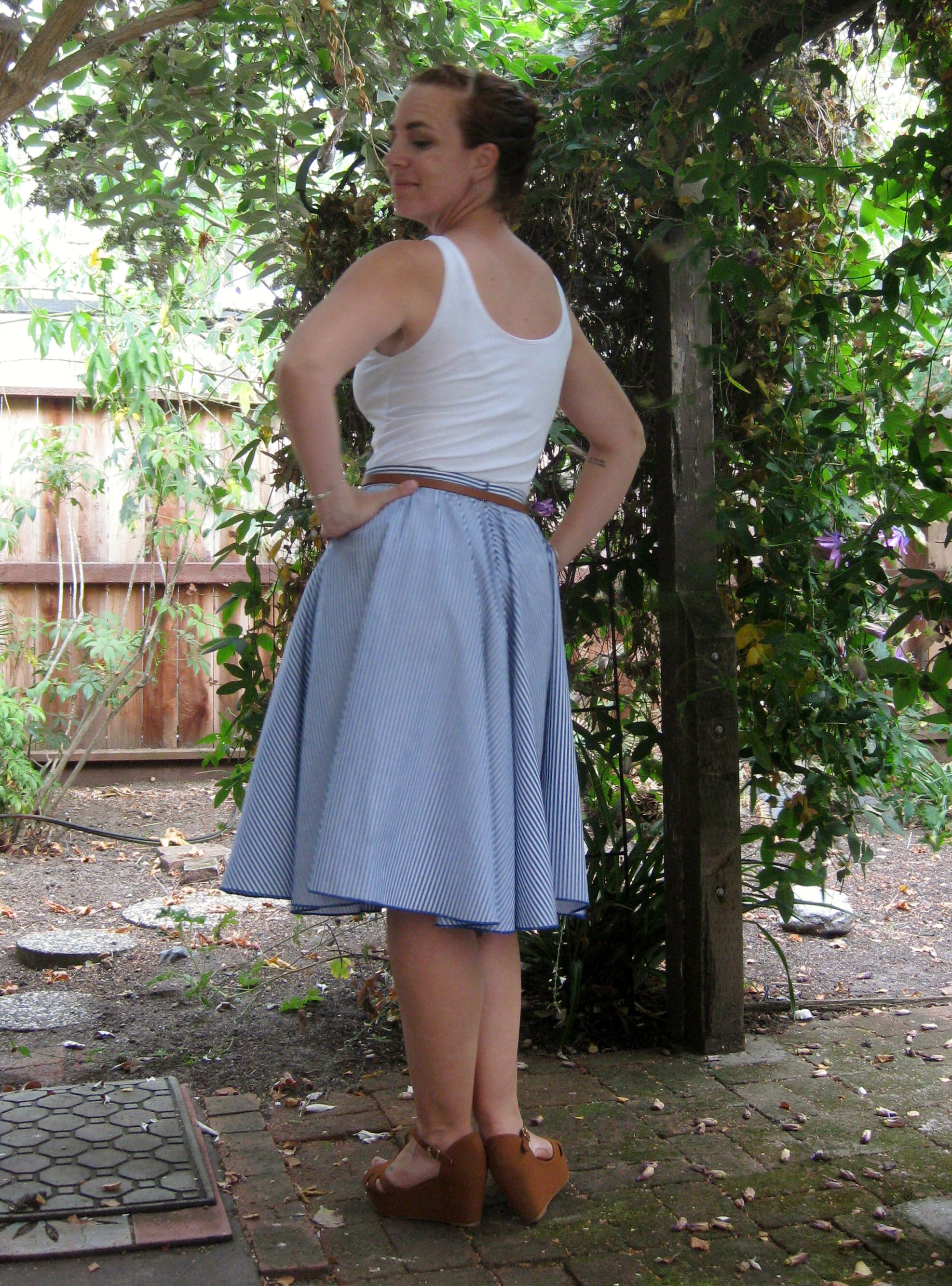 I chose to leave the skirt as it was, but removed the waist band, re-sized it to fit me now and then gathered the skit to fit the new waistband. This way there was a little extra fullness at the waist, and I didn’t have to mess with getting the stripes to match up again.